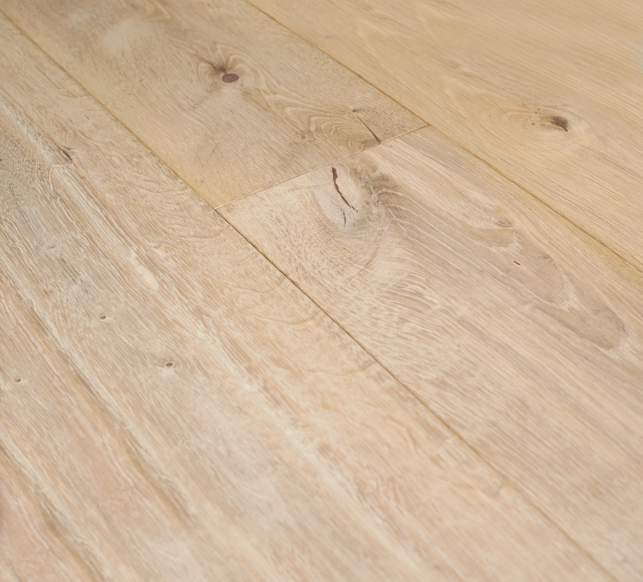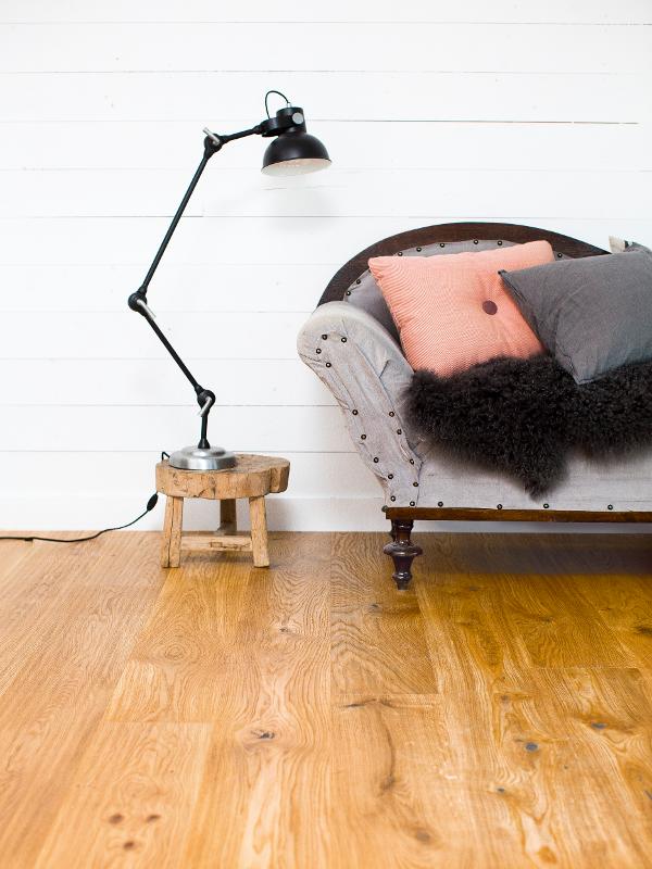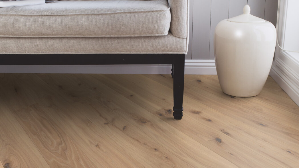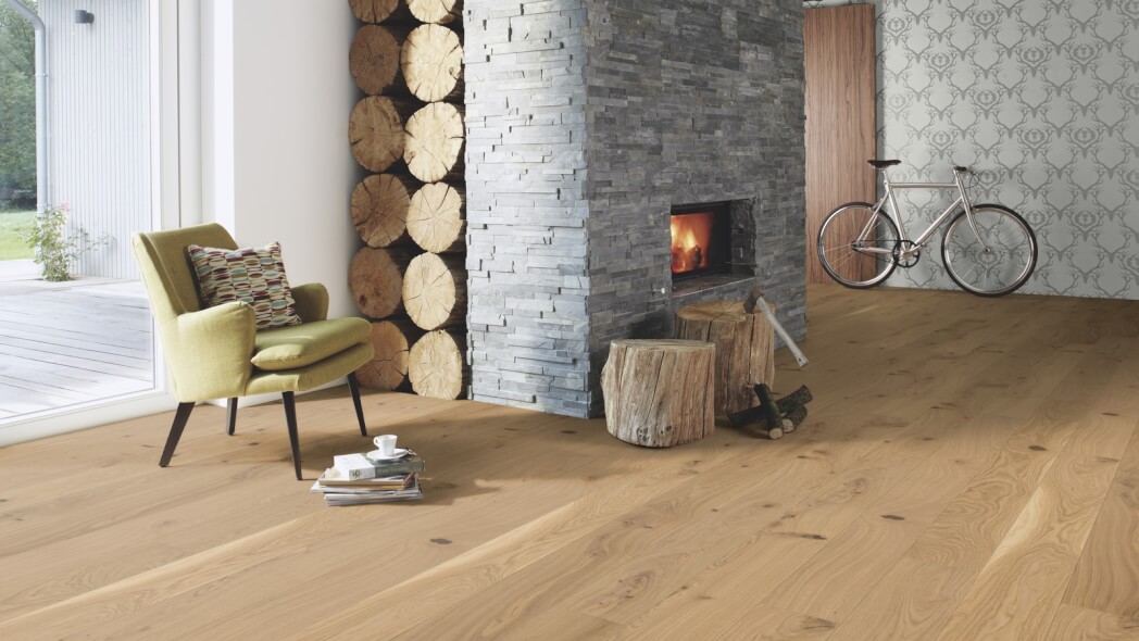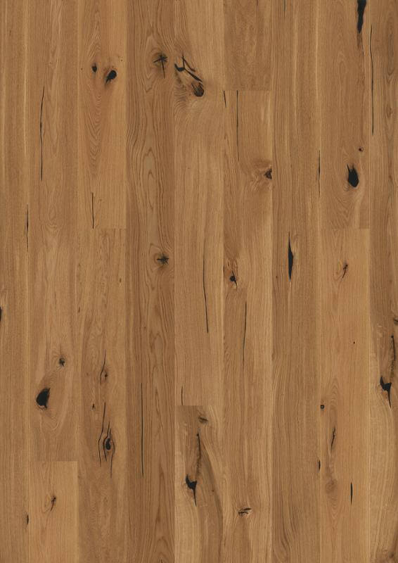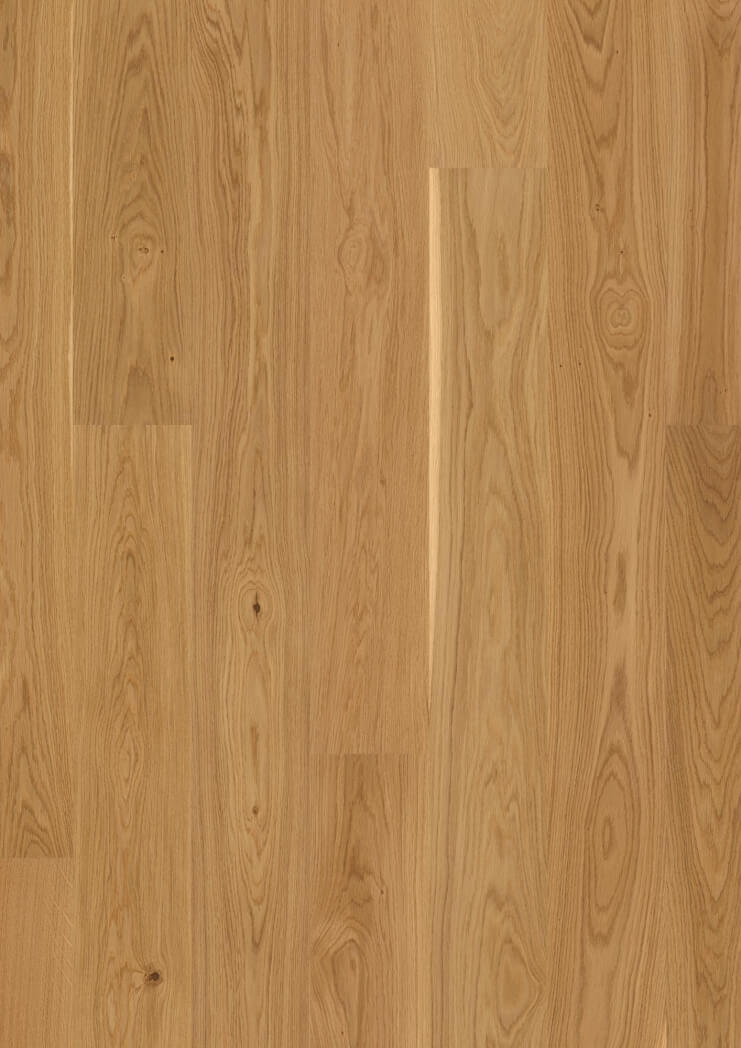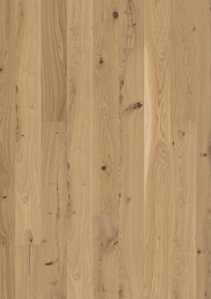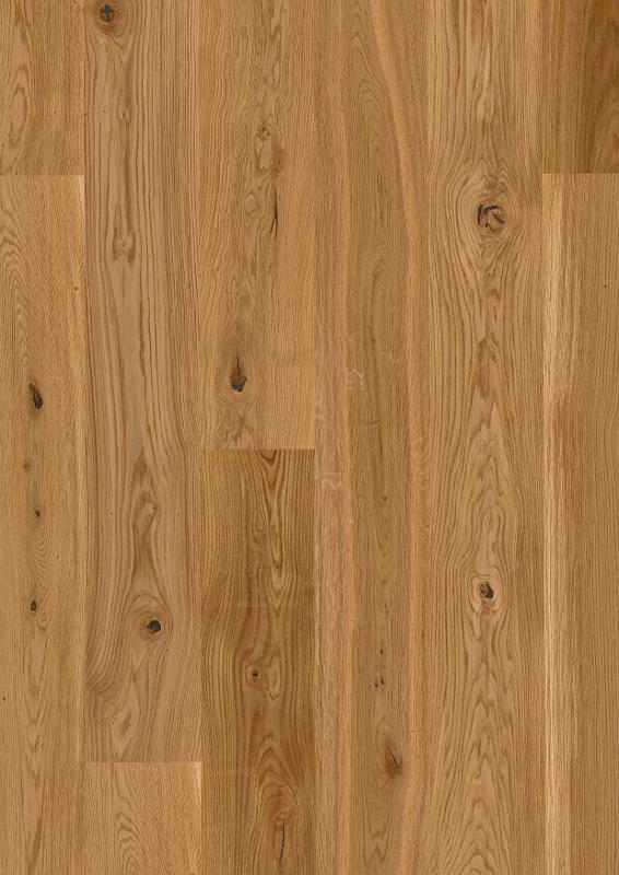 Dąb wykończony lakierem Live Pure, 2-stronnie fazowany, szczotkowany.