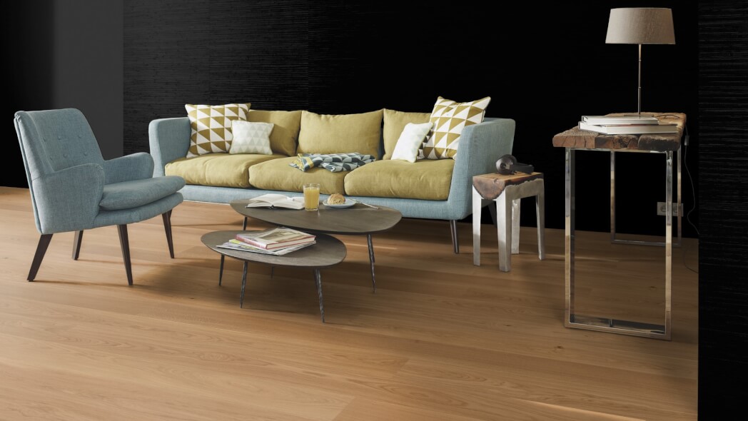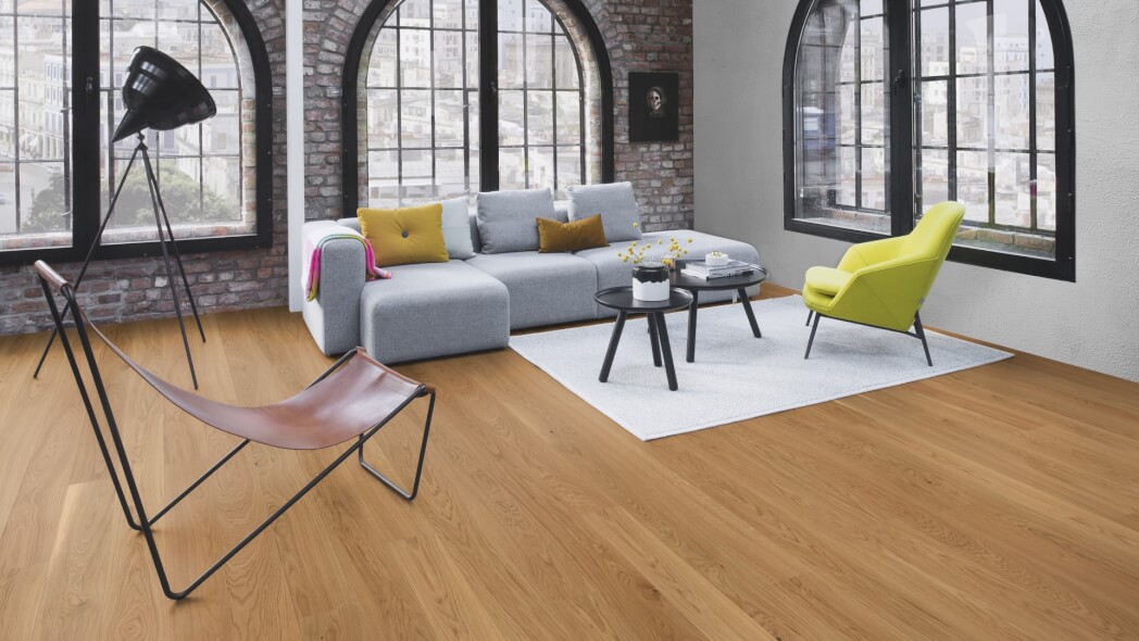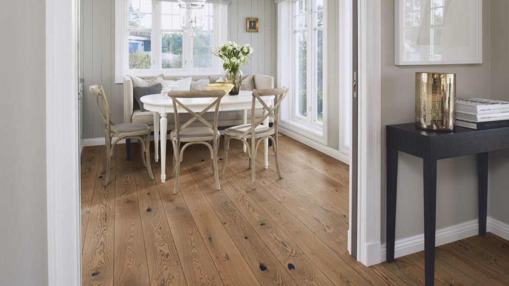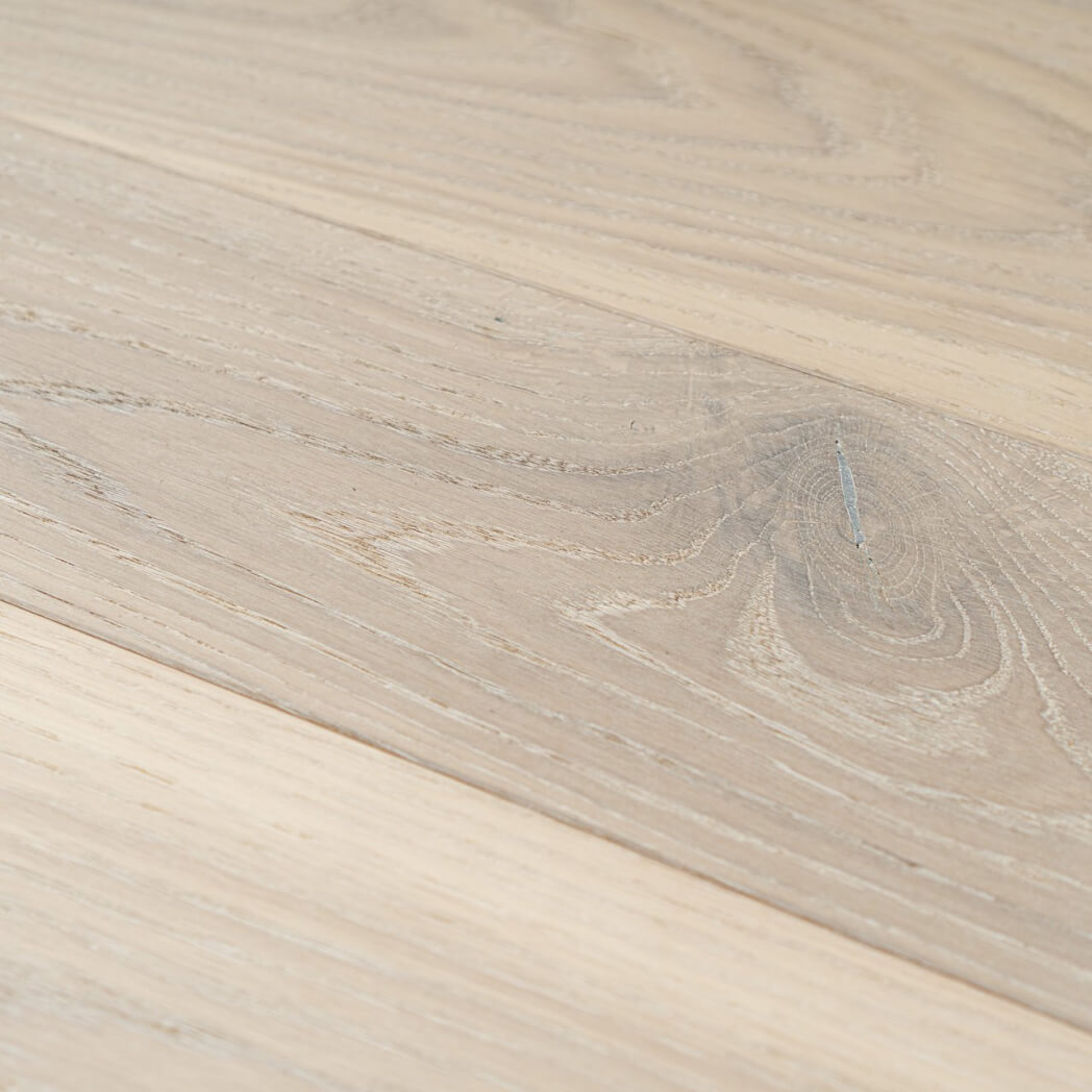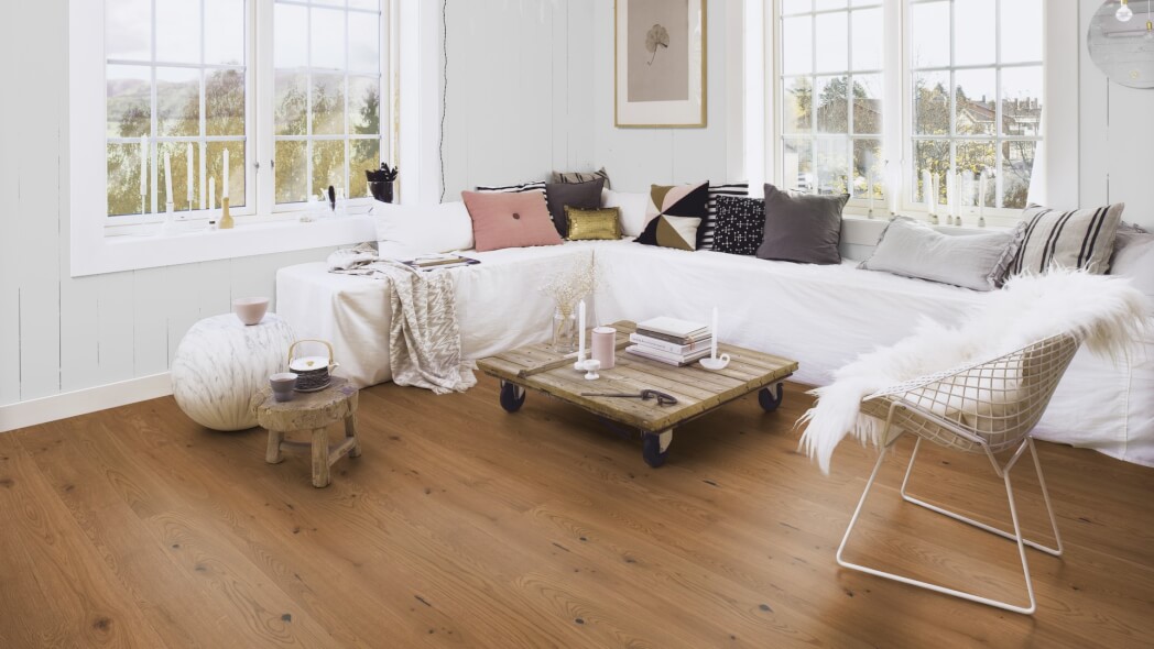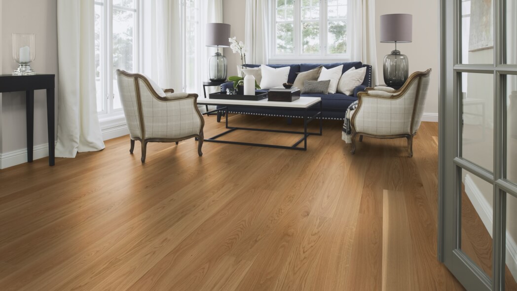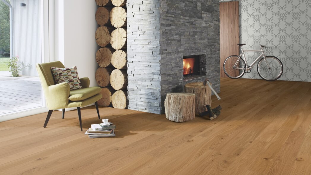 Dąb wykończony lakierem Live Pure, 2-stronnie fazowany, szczotkowany.