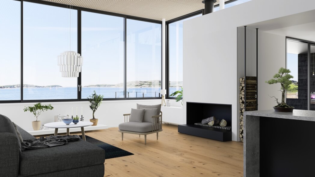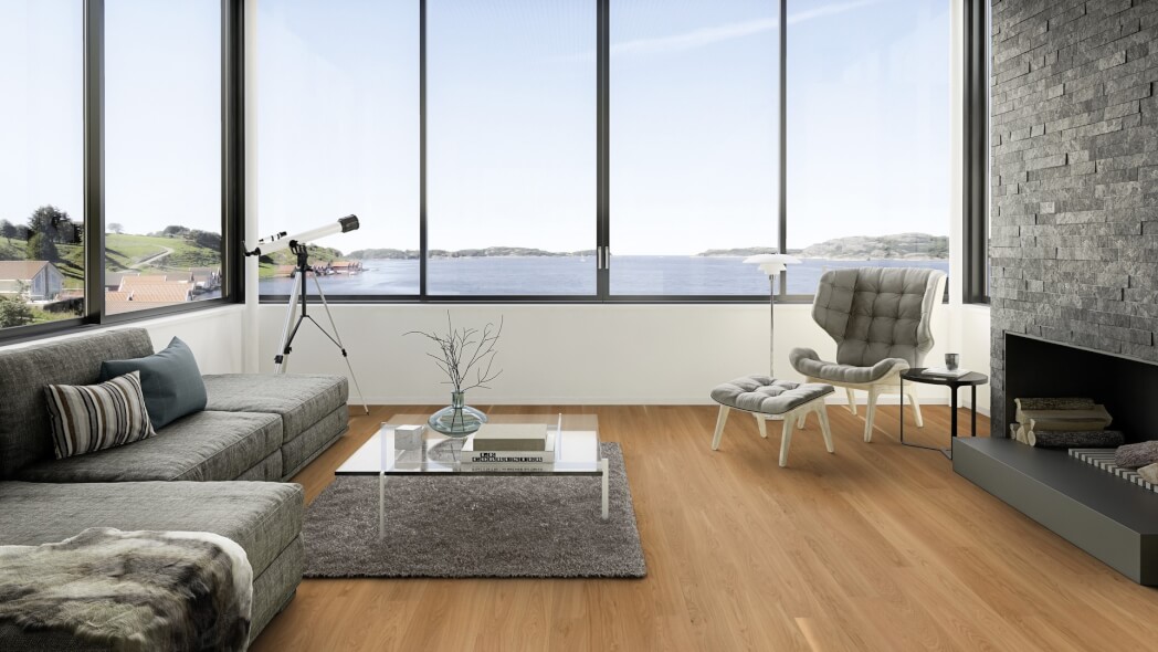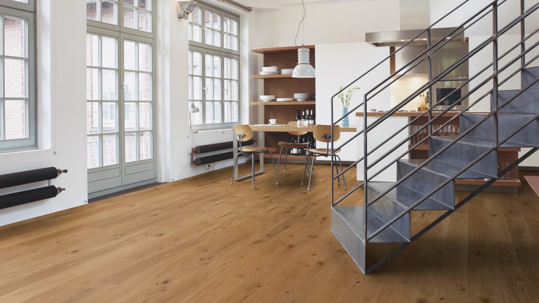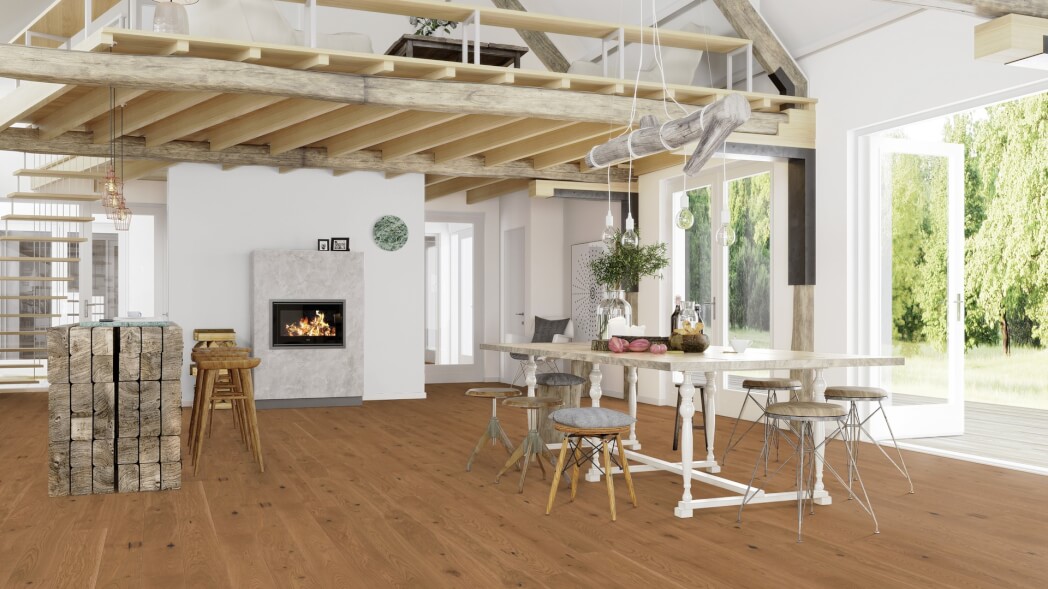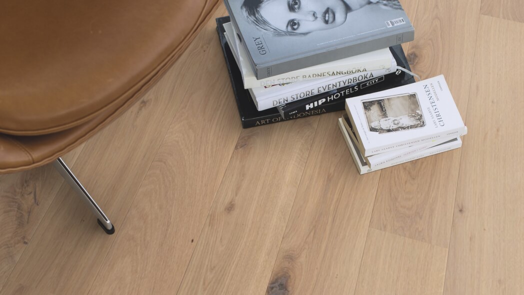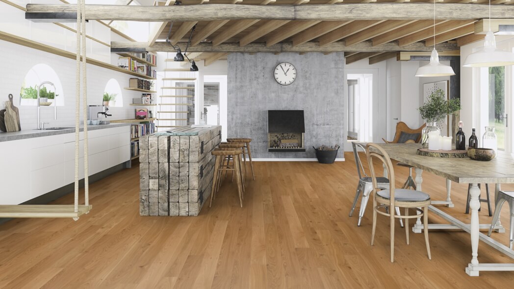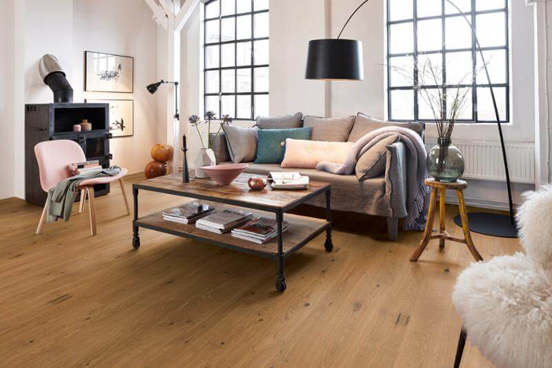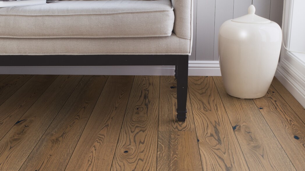Dąb wykończony lakierem Live Pure, 2-stronnie fazowany, szczotkowany.
